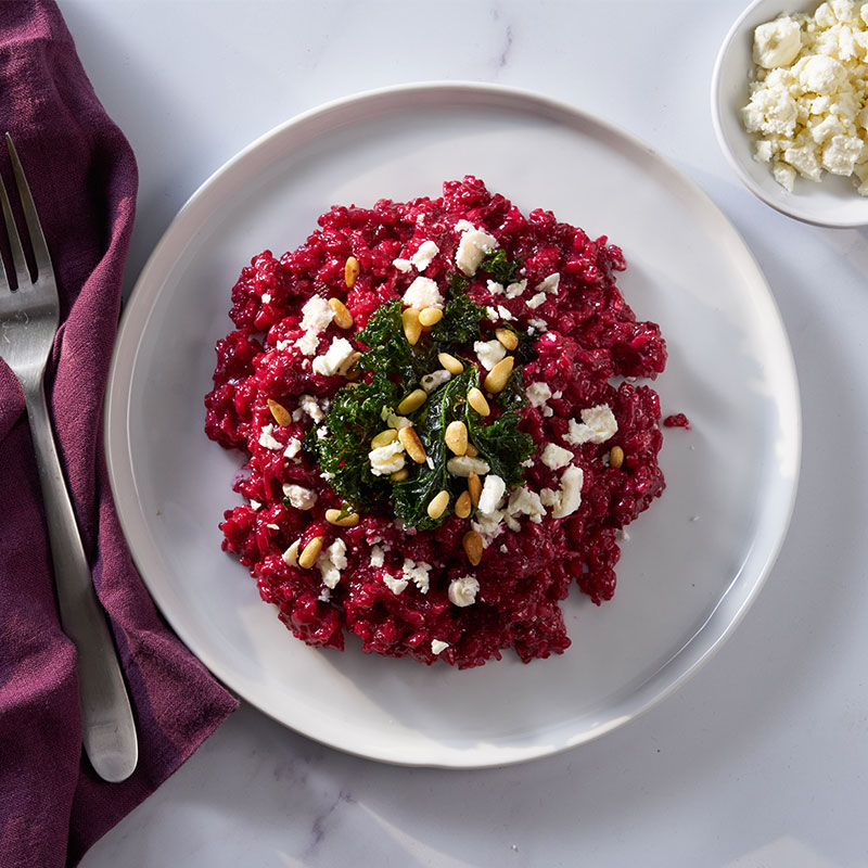 This vibrant dish showcases the versatility of kale by pairing its crisp, earthy crunch with creamy risotto made with US-grown Arborio Rice. The sweet, earthy flavor of the roasted beetroot purée provides a stunning magenta backdrop that complements the kale’s slightly bitter, robust flavor. Meanwhile, the kale’s delicate crispness contrasts beautifully with the risotto’s rich, velvety texture. Tangy feta and buttery, toasted pine nuts add layers of complexity, balancing the richness with brightness and nutty undertones.